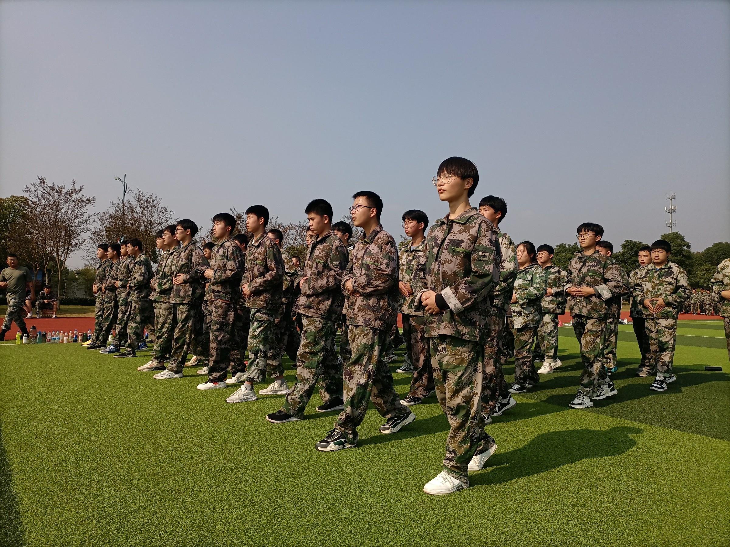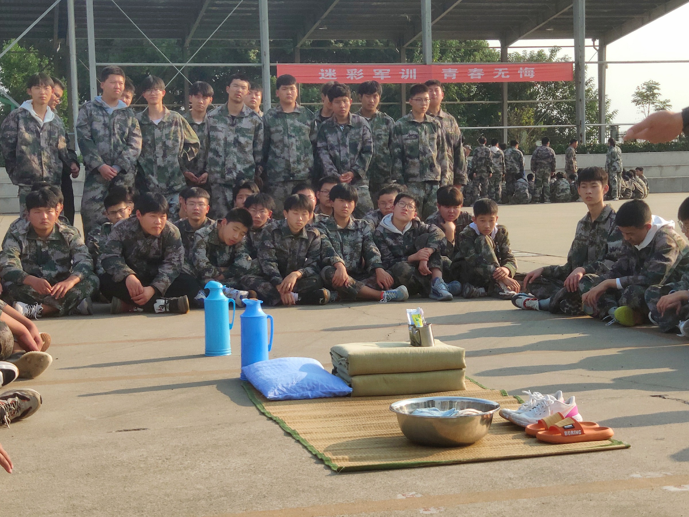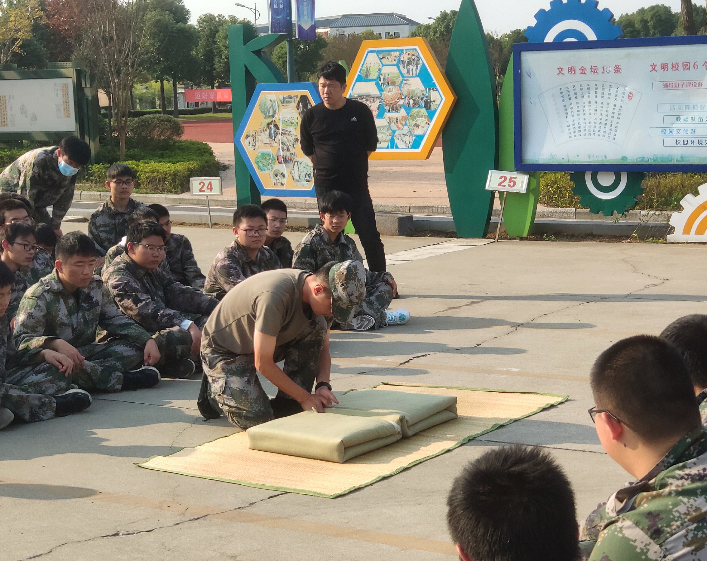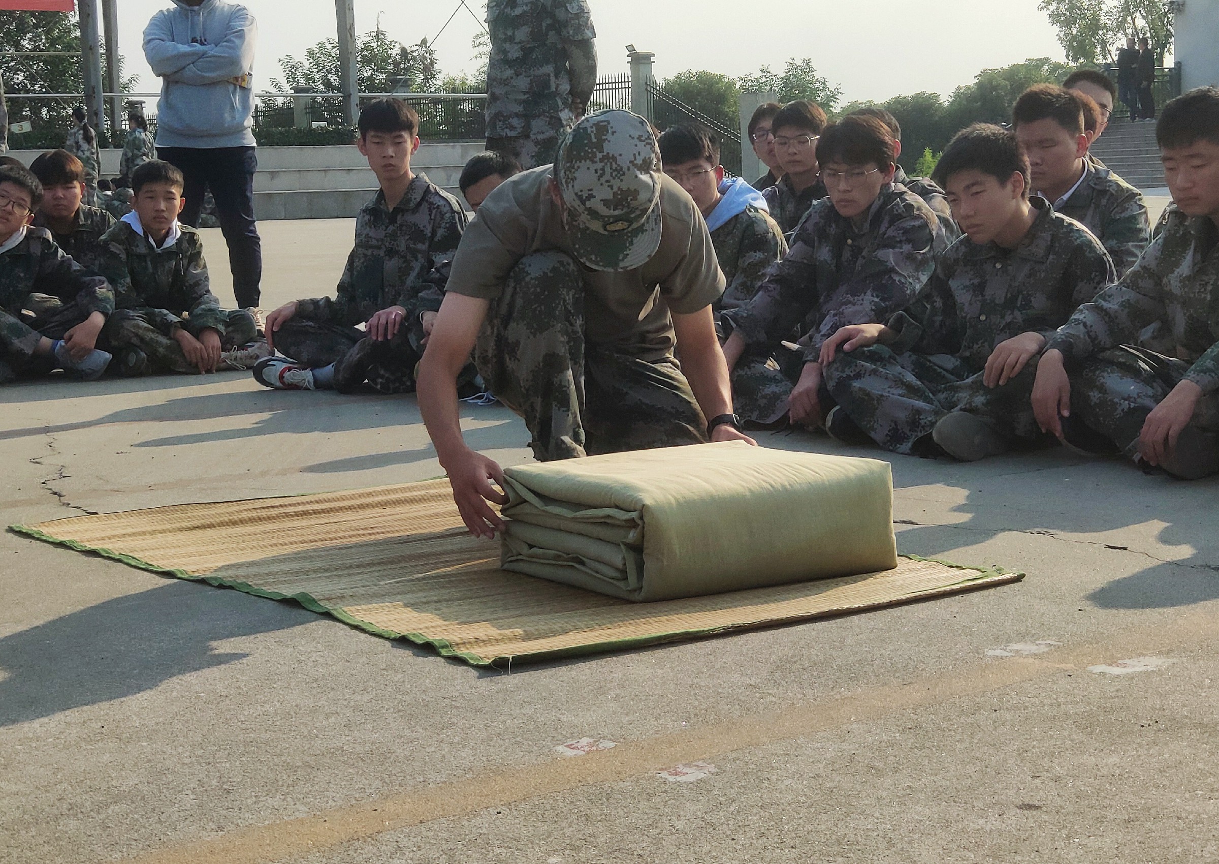 在基地领导、校领导精心组织的军训开营仪式过后,下午学员们正式迎来了军训的第一课——内务整理。集合、看齐、立正、稍息、摆臂、报数,整理队伍完毕,教官们以三个排为一单位,解疑答惑、积极引导,亲自向学员们演示了如何铺摆床单、床席、折叠军被、摆放鞋物、悬挂毛巾、整理洗漱用品等。烈日炎炎下,代表崇高军人气质的迷彩服湿漉漉的贴紧学员们的每一寸肌肤,教官们用军人的敬业、专业深深感染着每一位学员,使得内务细化整理规范默默根植于学员心底,为后续规范、有序的军训生活打下坚实基础。腰板笔挺、目光坚定,烈日下,球场中,红旗边,方阵间,青春的风采尽数彰显。
